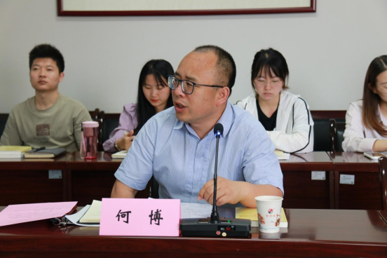 何博在汇报时从以加强对习近平新时代中国特色社会主义思想研究阐释工作夯实践行立德树人根本任务的思想基础,以知名教授+科研平台+研究团队+宣讲团队的“四重奏”建构研究阐释宣讲的新范式,以增强学理性研究、加强学科群支撑、推进体系性构建推动研究阐释宣讲工作的升维发展等方面介绍了我校研究阐释宣讲习近平新时代中国特色社会主义思想的基本情况。