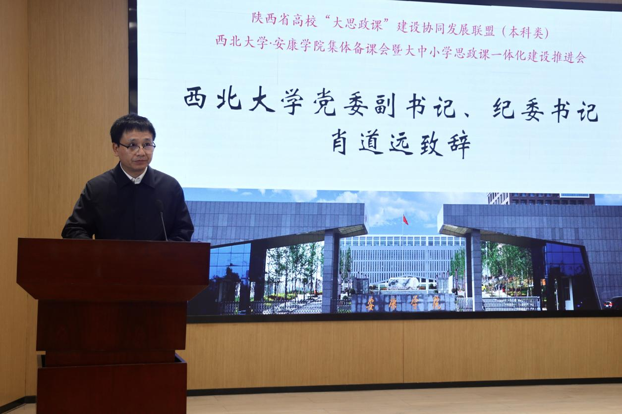 5月10日下午,在开幕式上安康学院党委书记钟生海和西北大学党委副书记、纪委书记、省纪委监委驻校纪检监察组组长肖道远分别作了致辞。钟生海指出,将习近平文化思想融入高校思想政治工作和思政课教学,既是落实立德树人根本任务的必然要求,也是推动思政课内涵式发展的重要途径。肖道远指出,2023年至今,联盟先后联合省内多所高校,开展了多次集体备课会,增进了校际间的交流与联系。他希望西北大学和兄弟高校一道,以联盟为依托,共同打造“三大平台”:“大思政课”建设集体备课平台、“大思政课”建设标杆示范、“大思政课”建设校际交流平台,切实推动陕西省高校“大思政课”的联动创新。